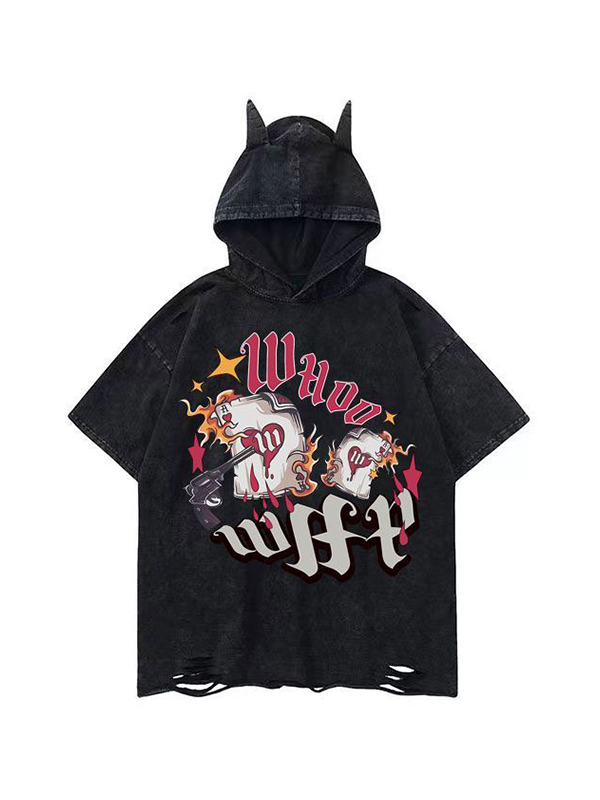 Men’s Distressed Print Tattered Hem Hooded Short Sleeve Tee