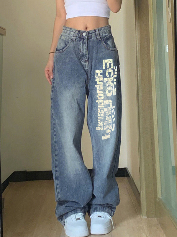Washed Letter Print High Waist Boyfriend Jeans