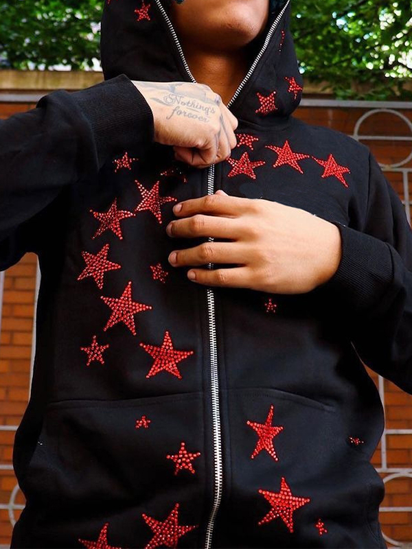 Men’s Star Rhinestone Print Zip Up Oversized Hoodie