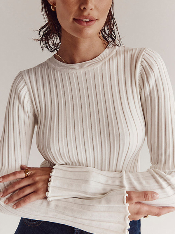 Solid Ribbed Crew Neck Long Sleeve Knit