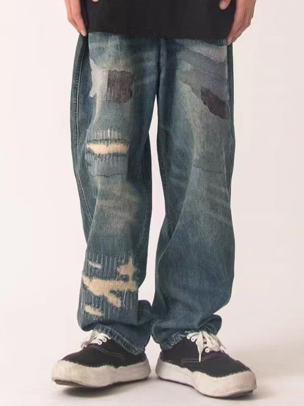 Men’s Distressed Various Patch Decor Loose Jeans