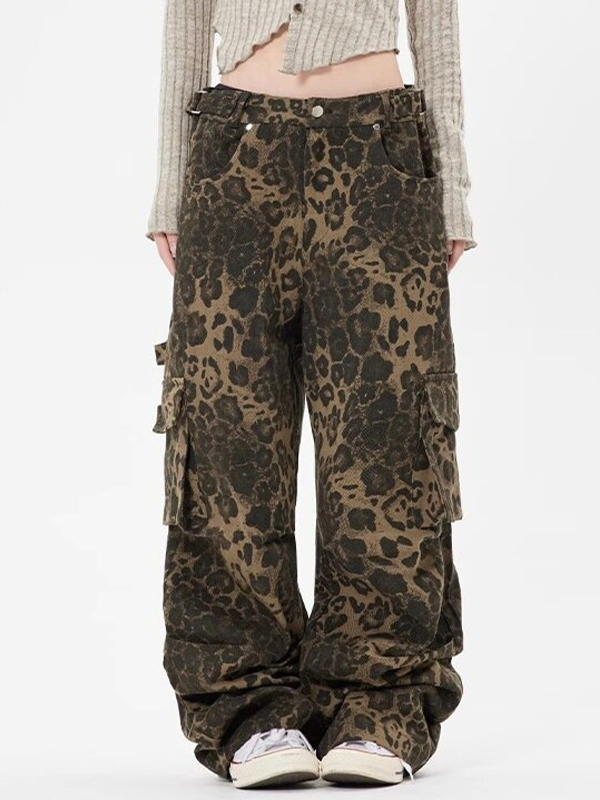 Leopard Print Pocket Overalls Cargo Jeans