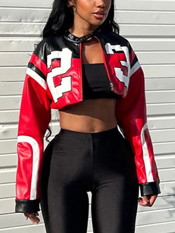 Contrast Color Letter Print Zip Up Cropped Jacket
