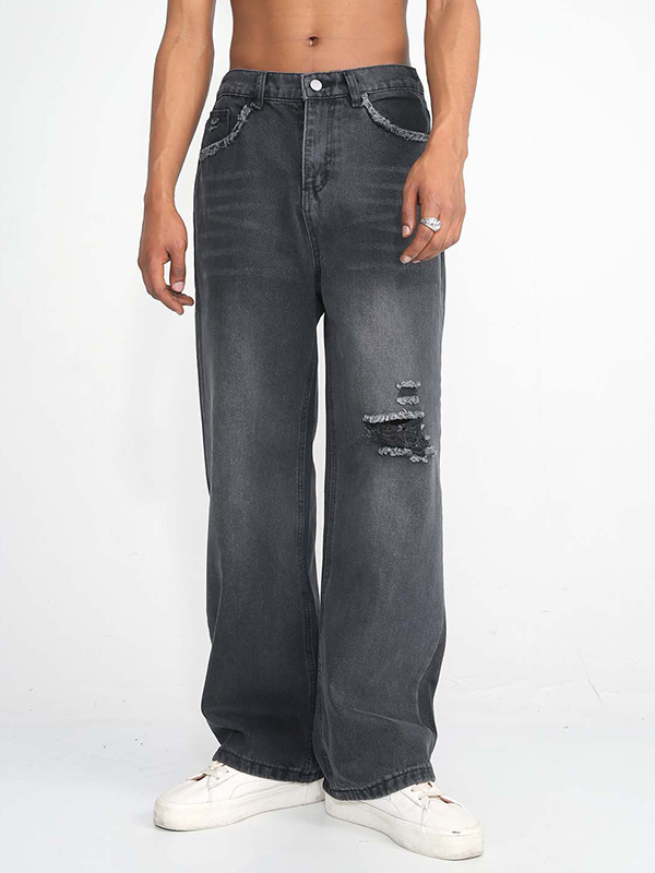 Straight Style American Trendy Hole Ripped Jeans