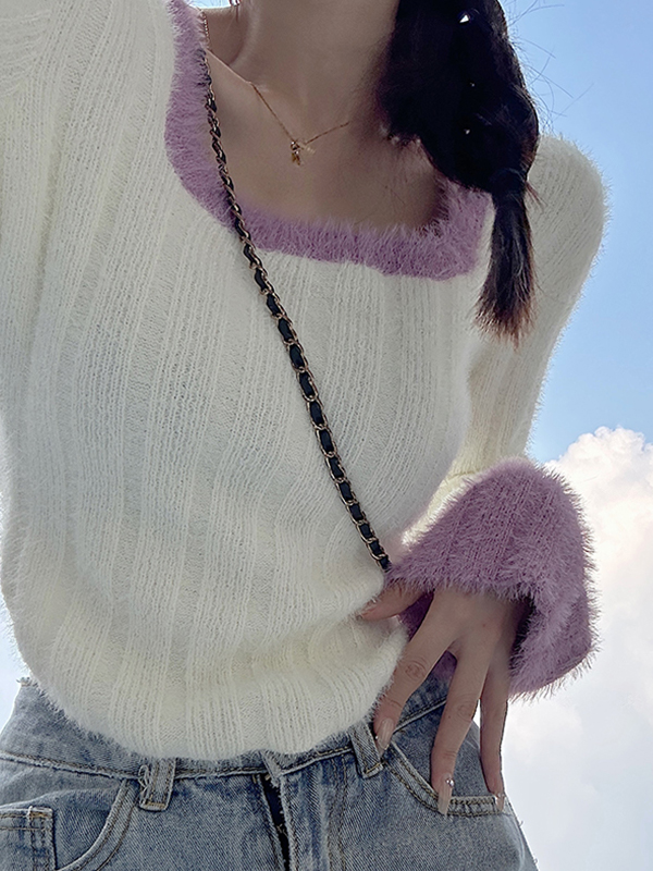 Contrast Color Splice Trumpet Sleeve Slim Sweater