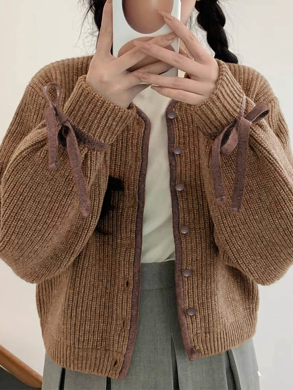 Contrast Trim Bow Decor Knit Cardigan