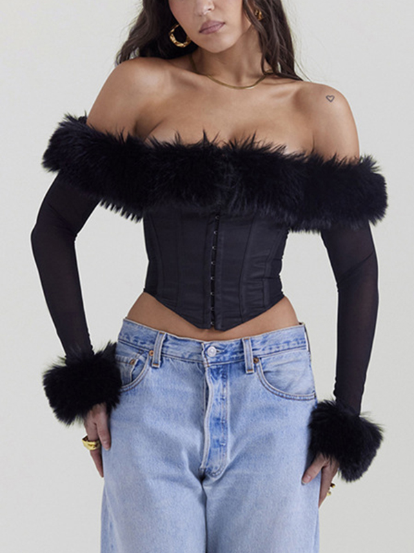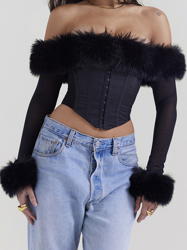 Fuzzy Trim Off Shoulder Mesh Breasted Corset Top