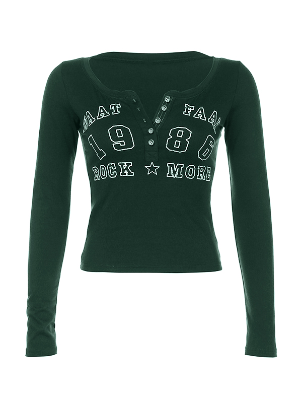 Number Letter Print Breasted Slim Long Sleeve Tee