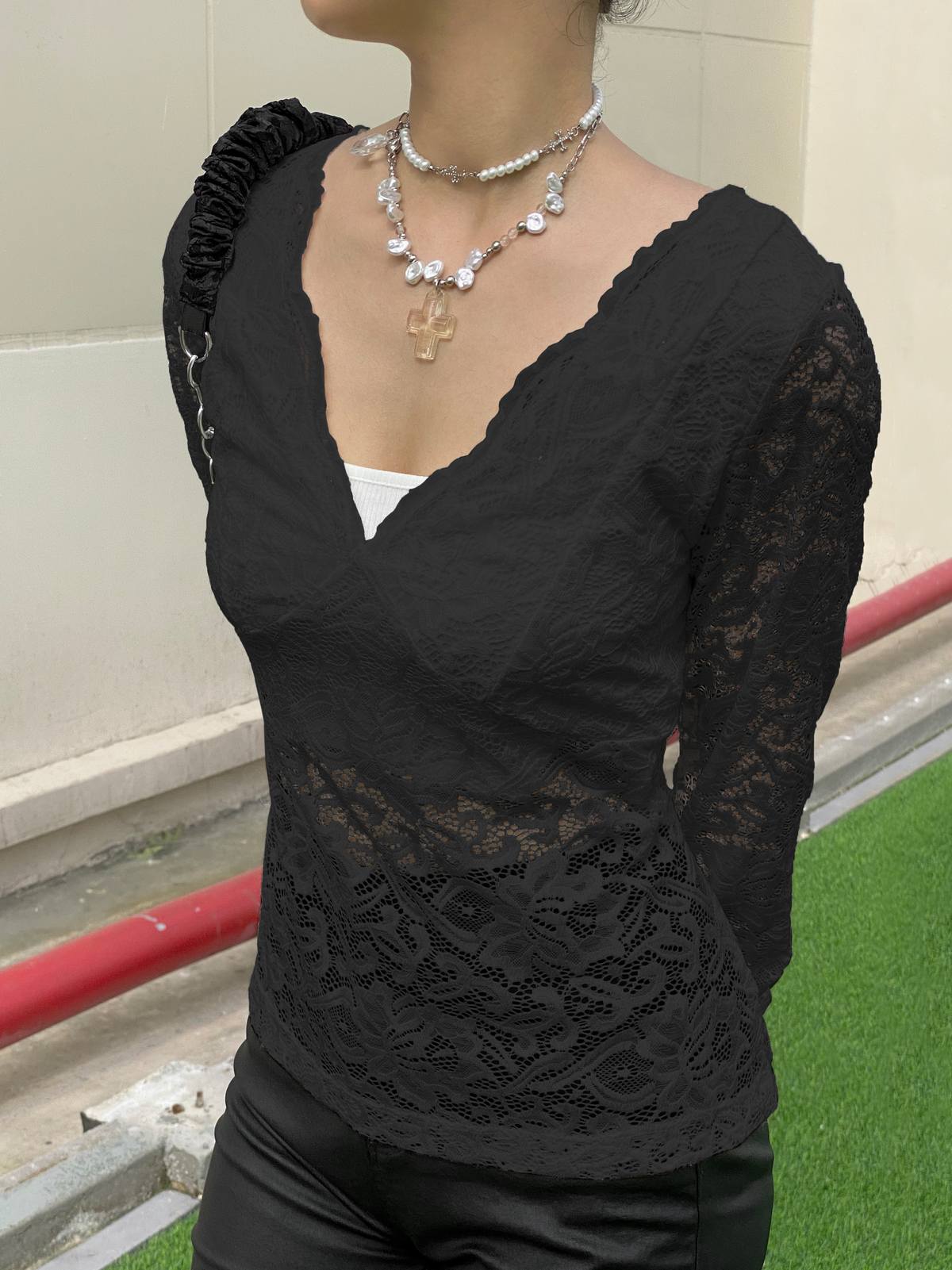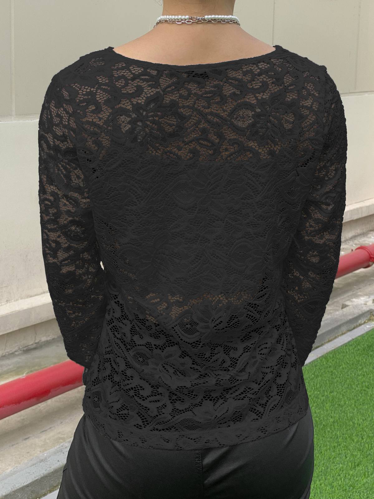 Description: It's crafted from sheer lace fabric, featured a plunge v-neckStyle, and paneled seam detail under the bust.