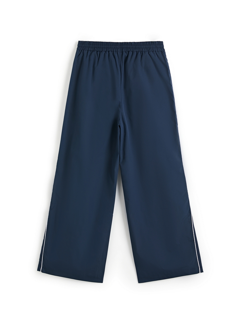 Description: These girls parachuteStyle pants are retro and sporty. Cuts to a super relaxed silhouette, they have a drawcord tie waistStyle, features contrast piping details along the side, with front side pockets, and has a logo detail on it.